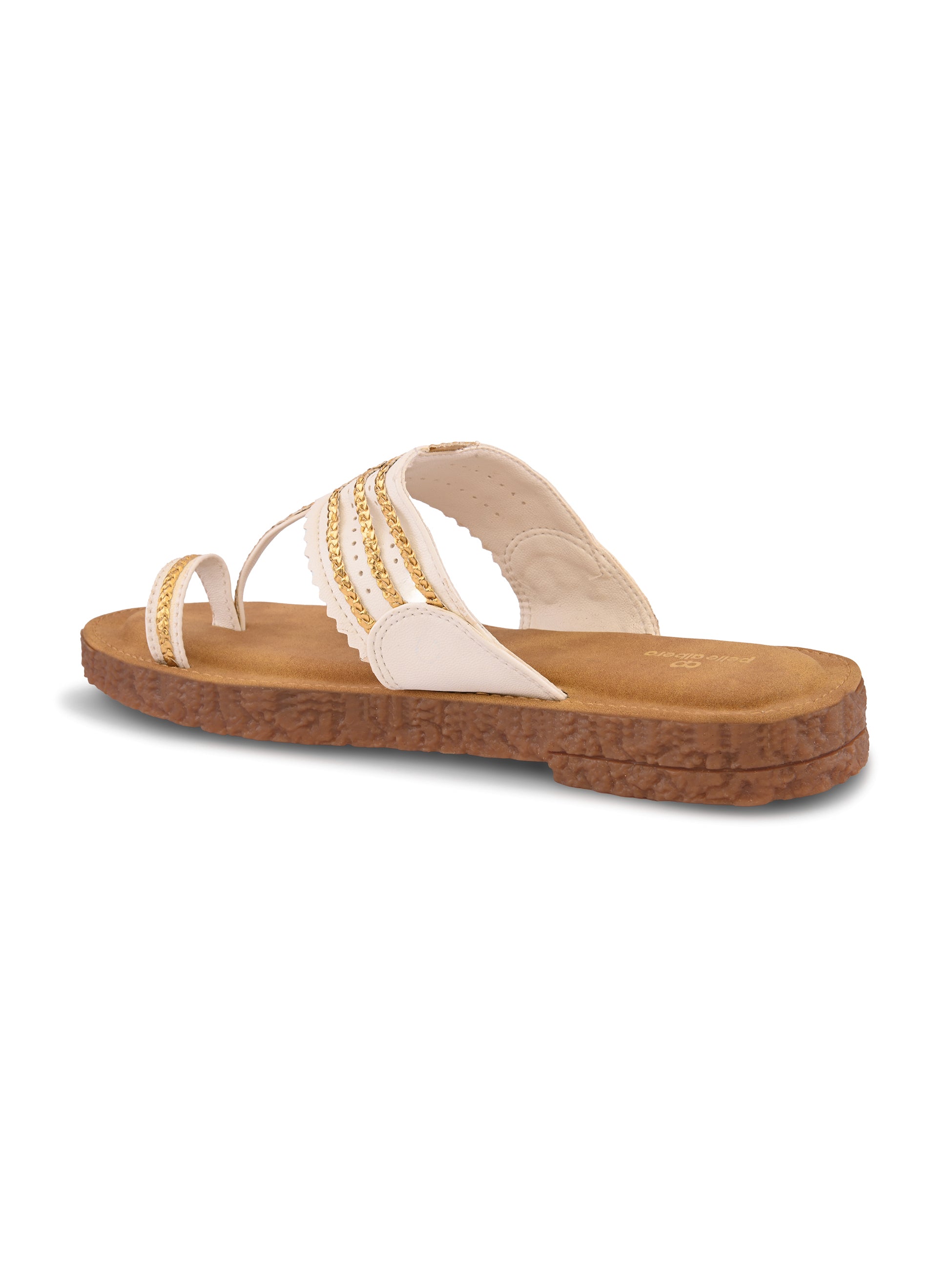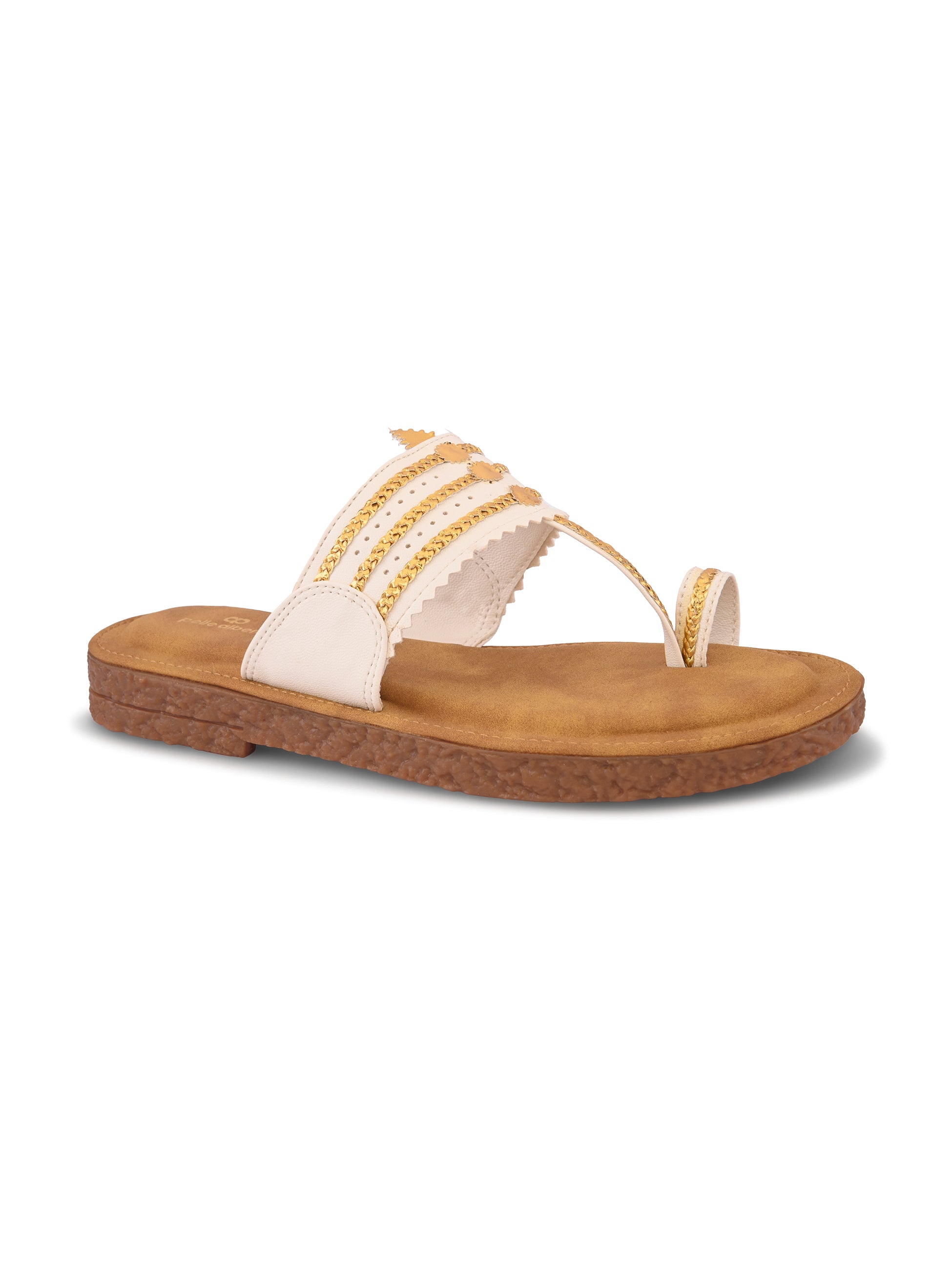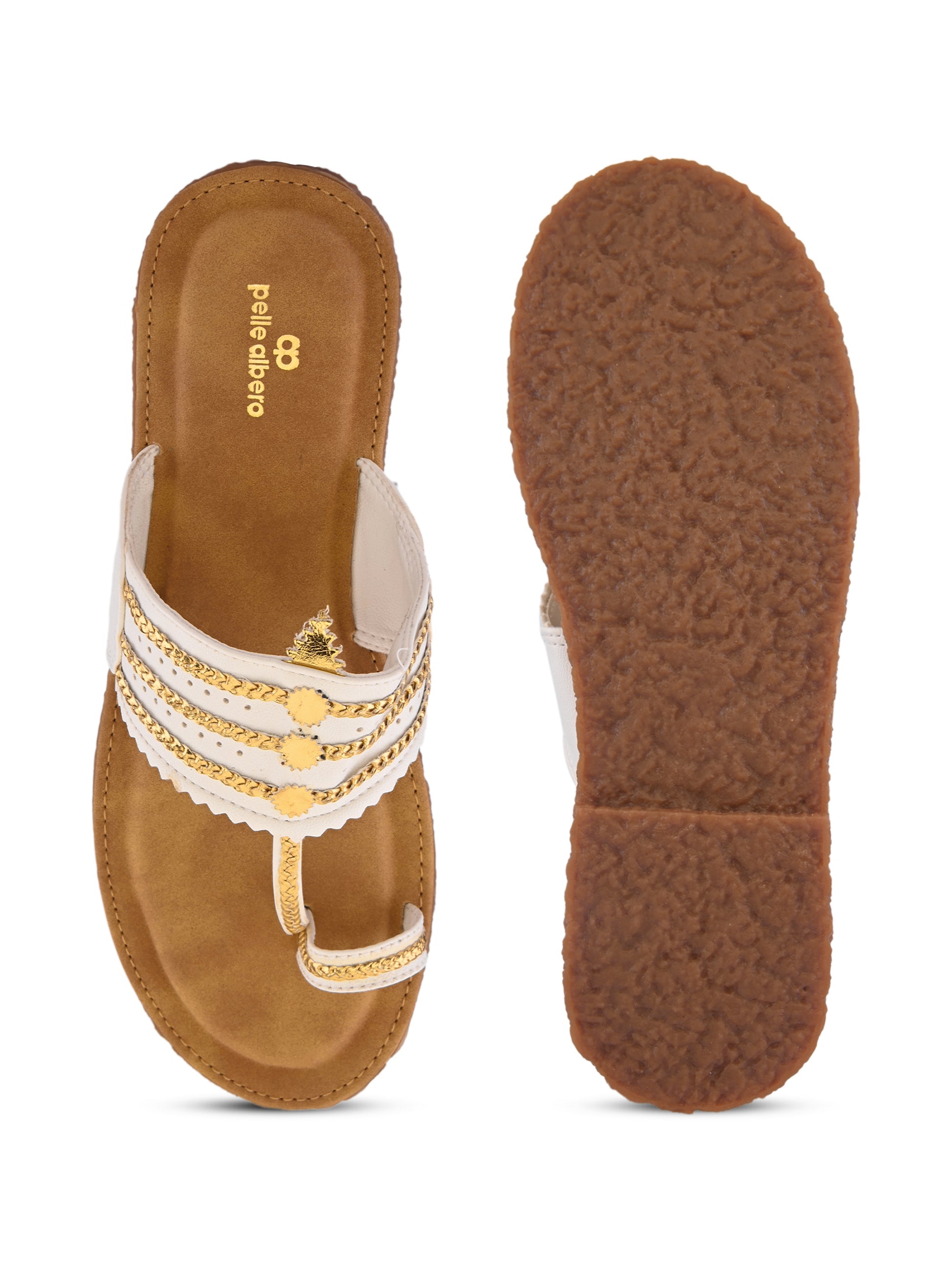 Pelle Albero Women White Colour MaxComfort Kolhapuri Flat Sandals combine classic Indian design with modern comfort. Crafted with a premium synthetic upper in a rich White tone, these flats feature a traditional Kolhapuri pattern reimagined with a contemporary minimalist touch. The MaxComfort cushioned footbed ensures exceptional softness and all-day support, while the lightweight, anti-slip sole provides stability and ease with every step. Perfect for daily wear, festive looks, or ethnic styling, these sandals bring together heritage and everyday elegance effortlessly.