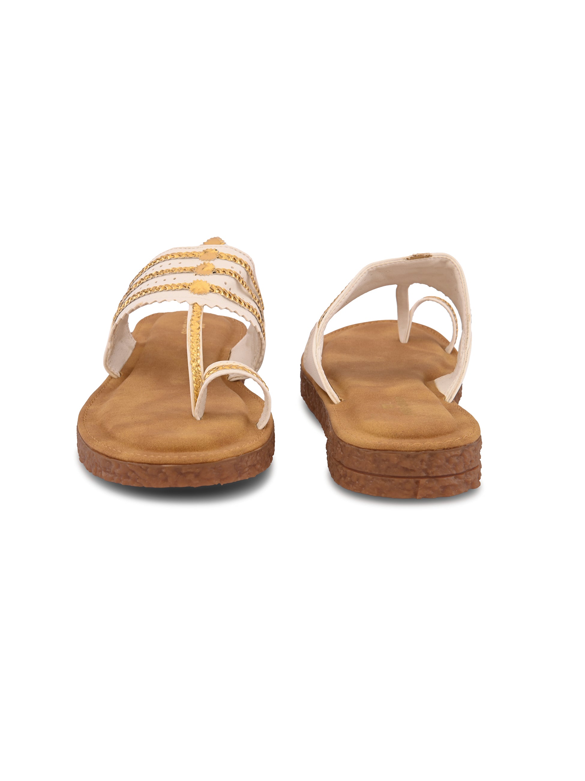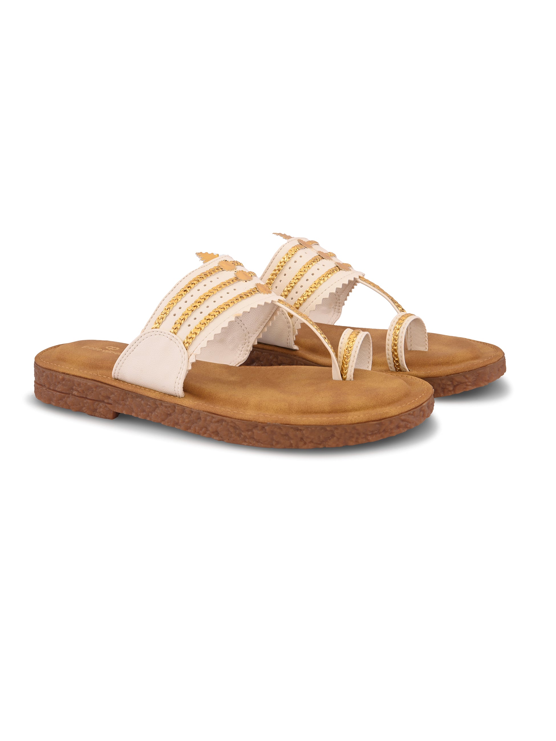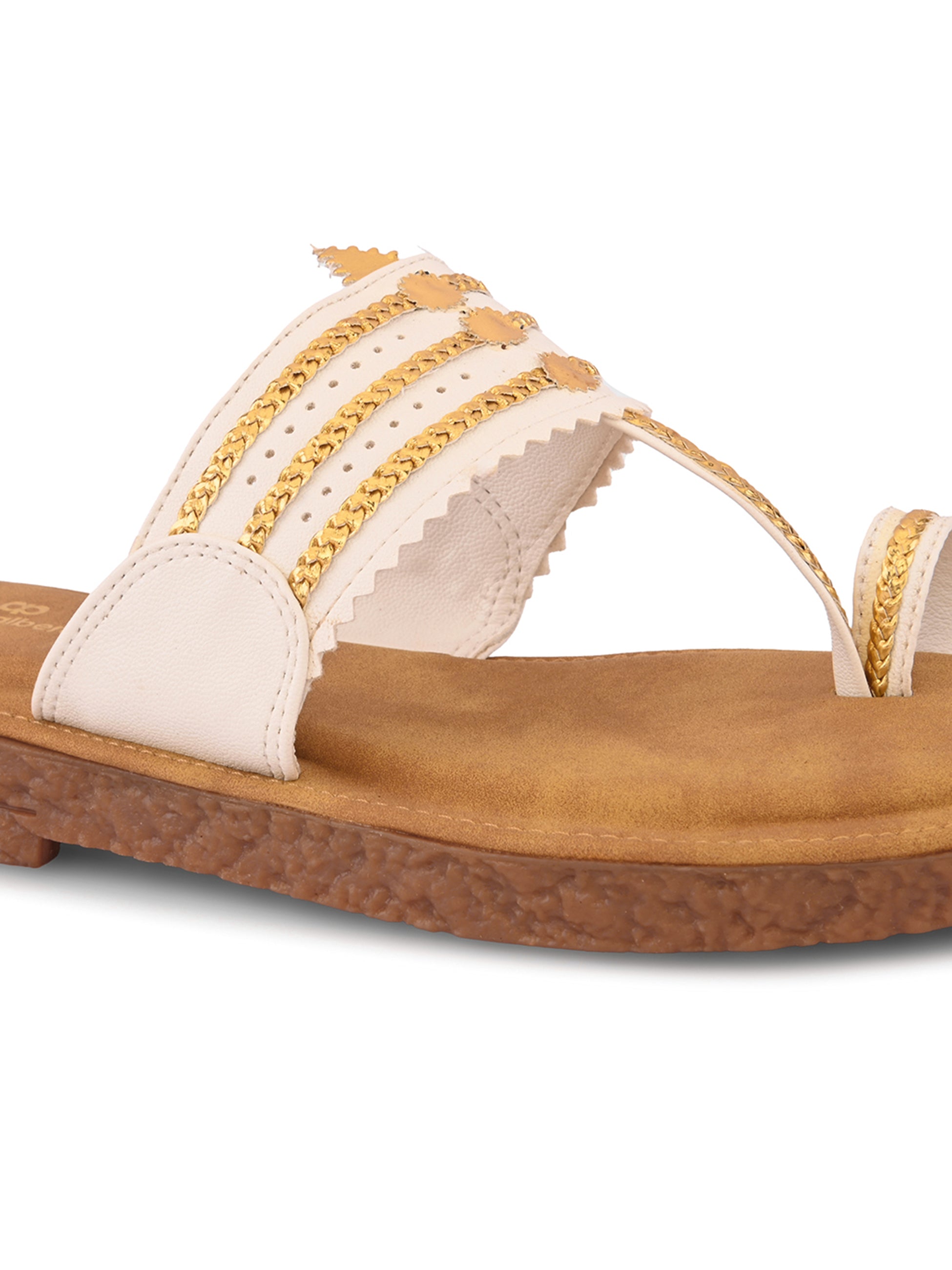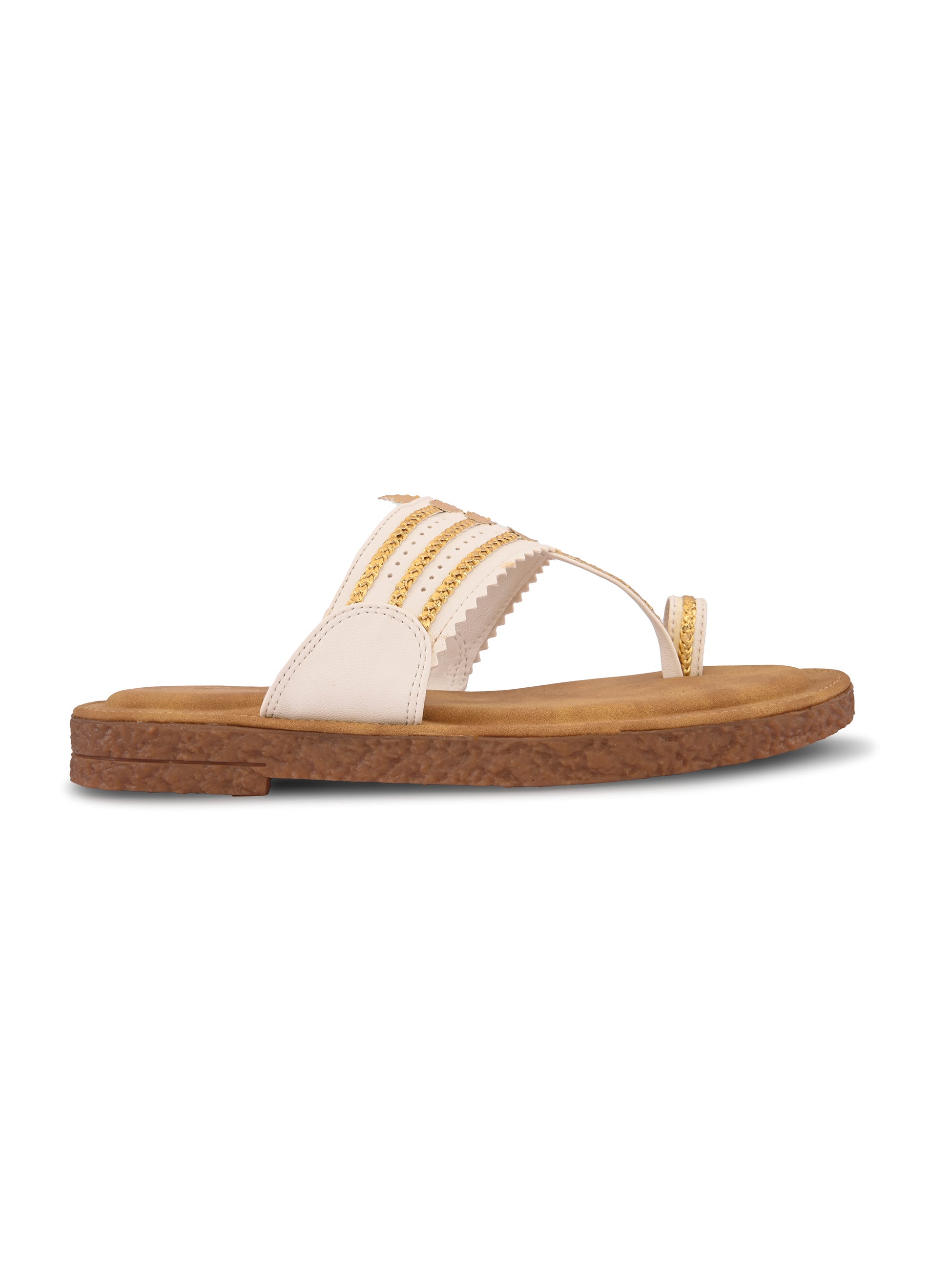 Pelle Albero Women White Colour MaxComfort Kolhapuri Flat Sandals combine classic Indian design with modern comfort. Crafted with a premium synthetic upper in a rich White tone, these flats feature a traditional Kolhapuri pattern reimagined with a contemporary minimalist touch. The MaxComfort cushioned footbed ensures exceptional softness and all-day support, while the lightweight, anti-slip sole provides stability and ease with every step. Perfect for daily wear, festive looks, or ethnic styling, these sandals bring together heritage and everyday elegance effortlessly.