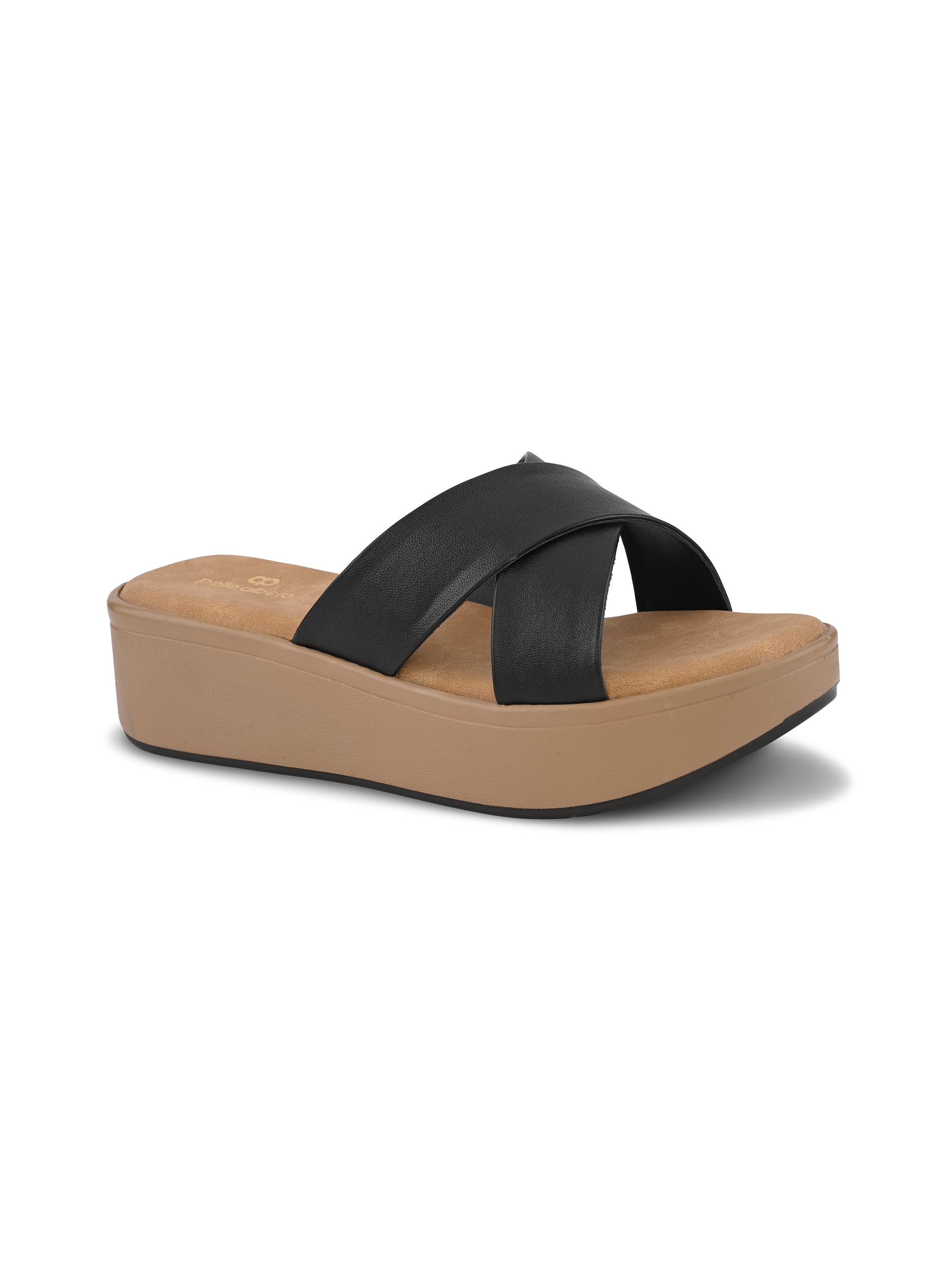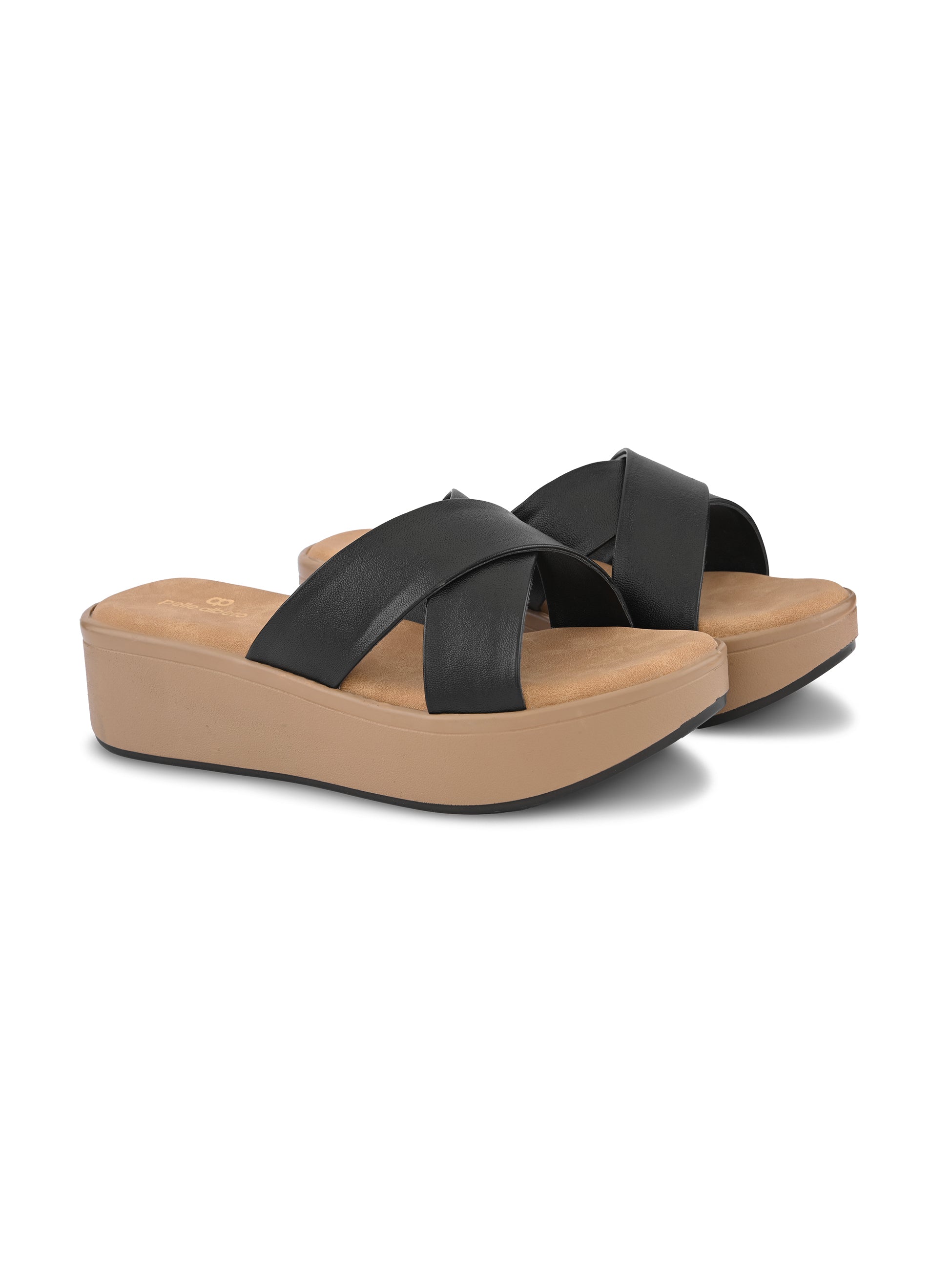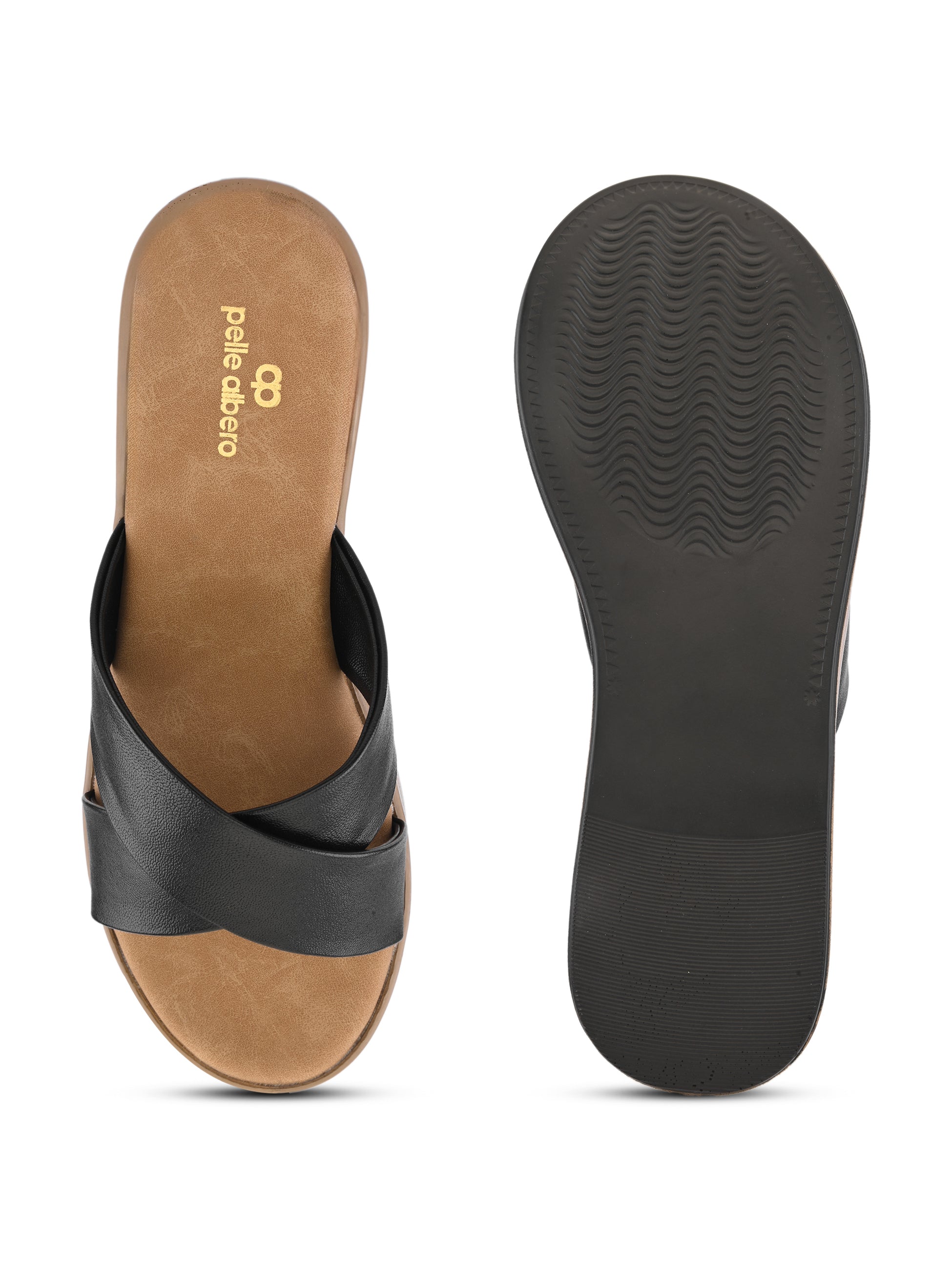 Pelle Albero Women Black Colour Wedge Heel Lightweight Comfort Sandals combine elegant design with superior comfort, making them a perfect pick for both everyday and festive wear. Crafted with a premium soft PU upper and a lightweight cushioned sole, these sandals offer all-day comfort without compromising on style. The ergonomic wedge heel provides subtle height and balanced support, ideal for long hours of wear. The classic black colour adds timeless appeal, easily pairing with ethnic outfits, dresses, or casual jeans. Designed for the modern woman who values style, stability, and comfort in every step.
