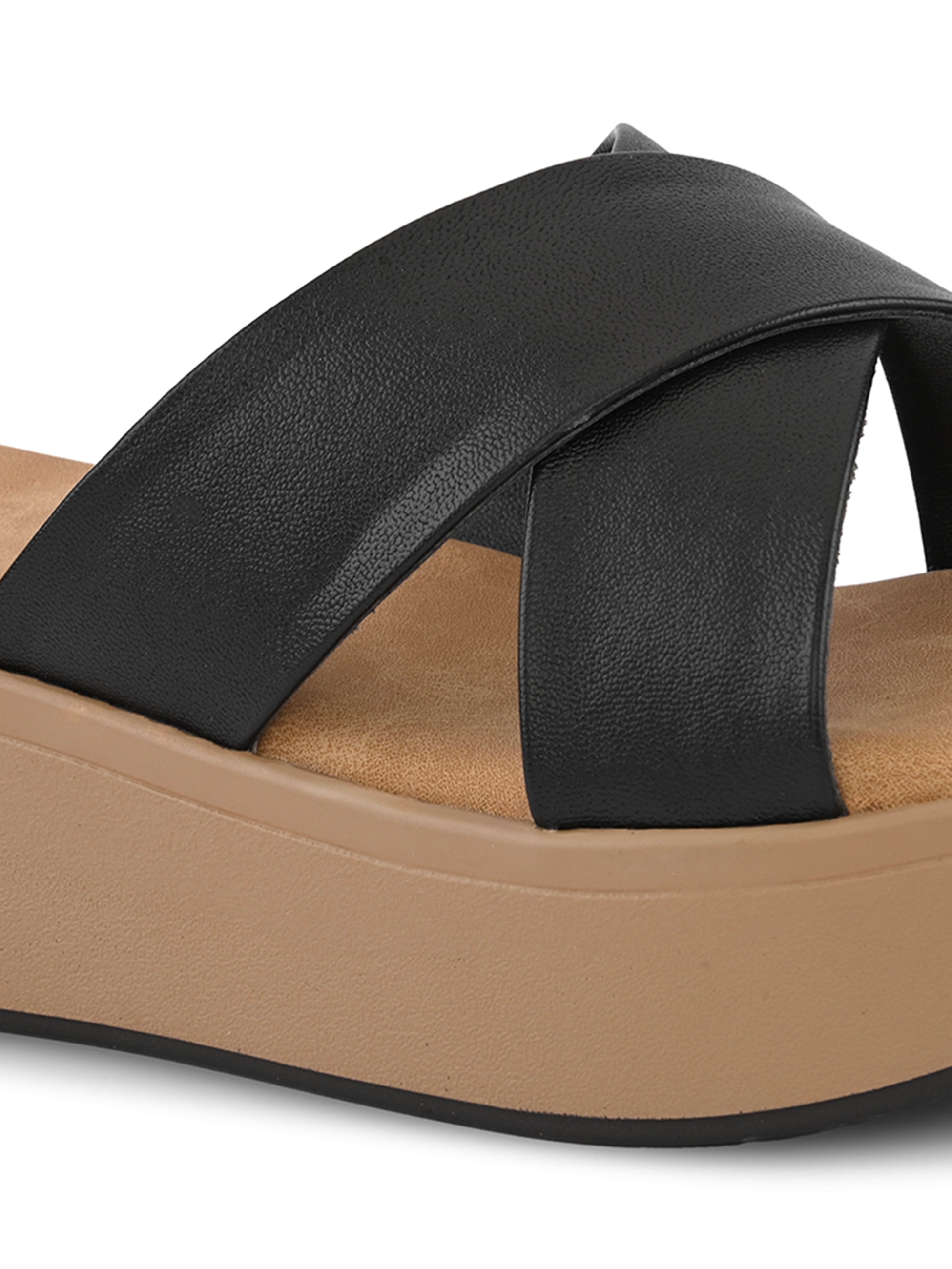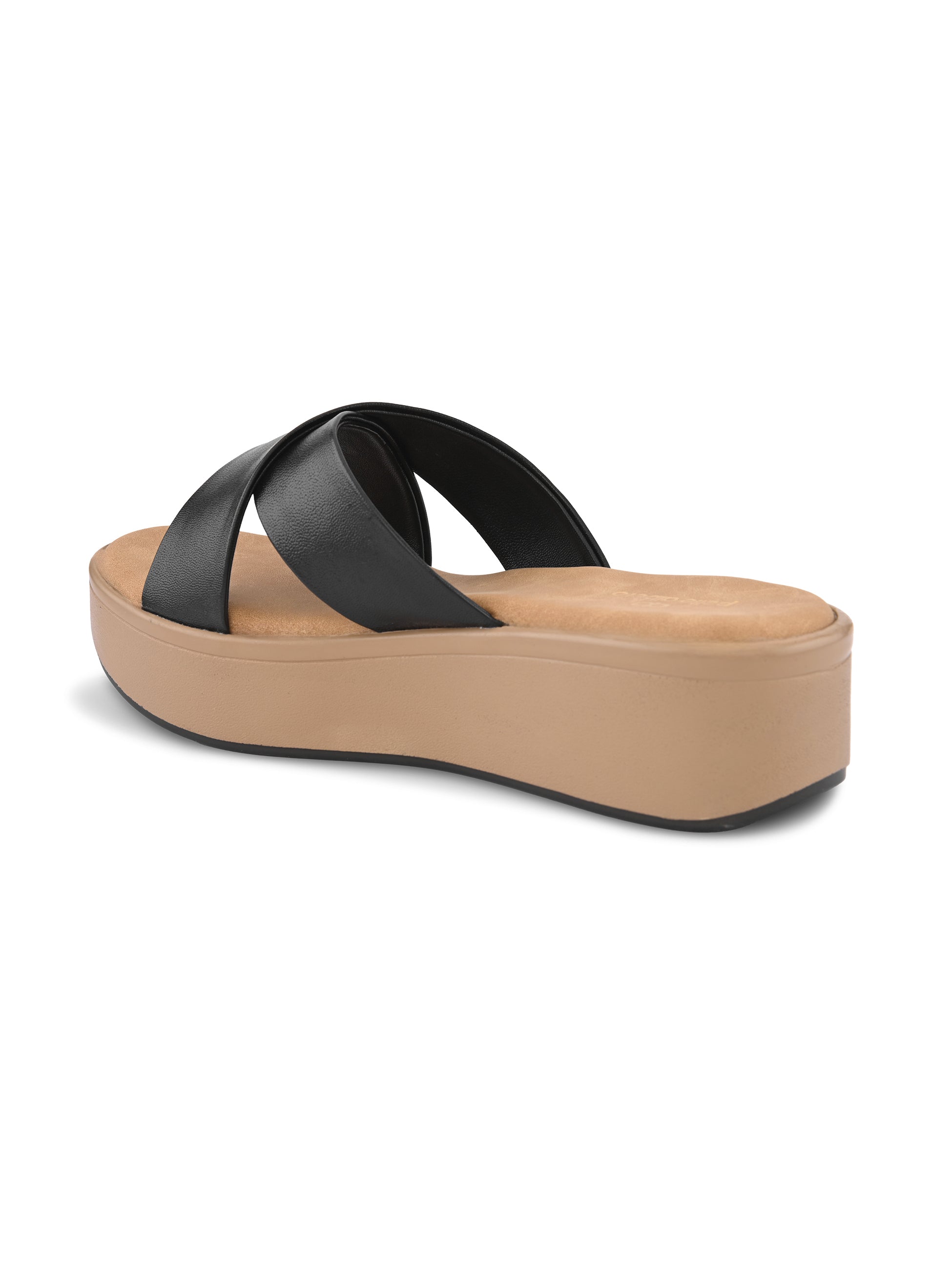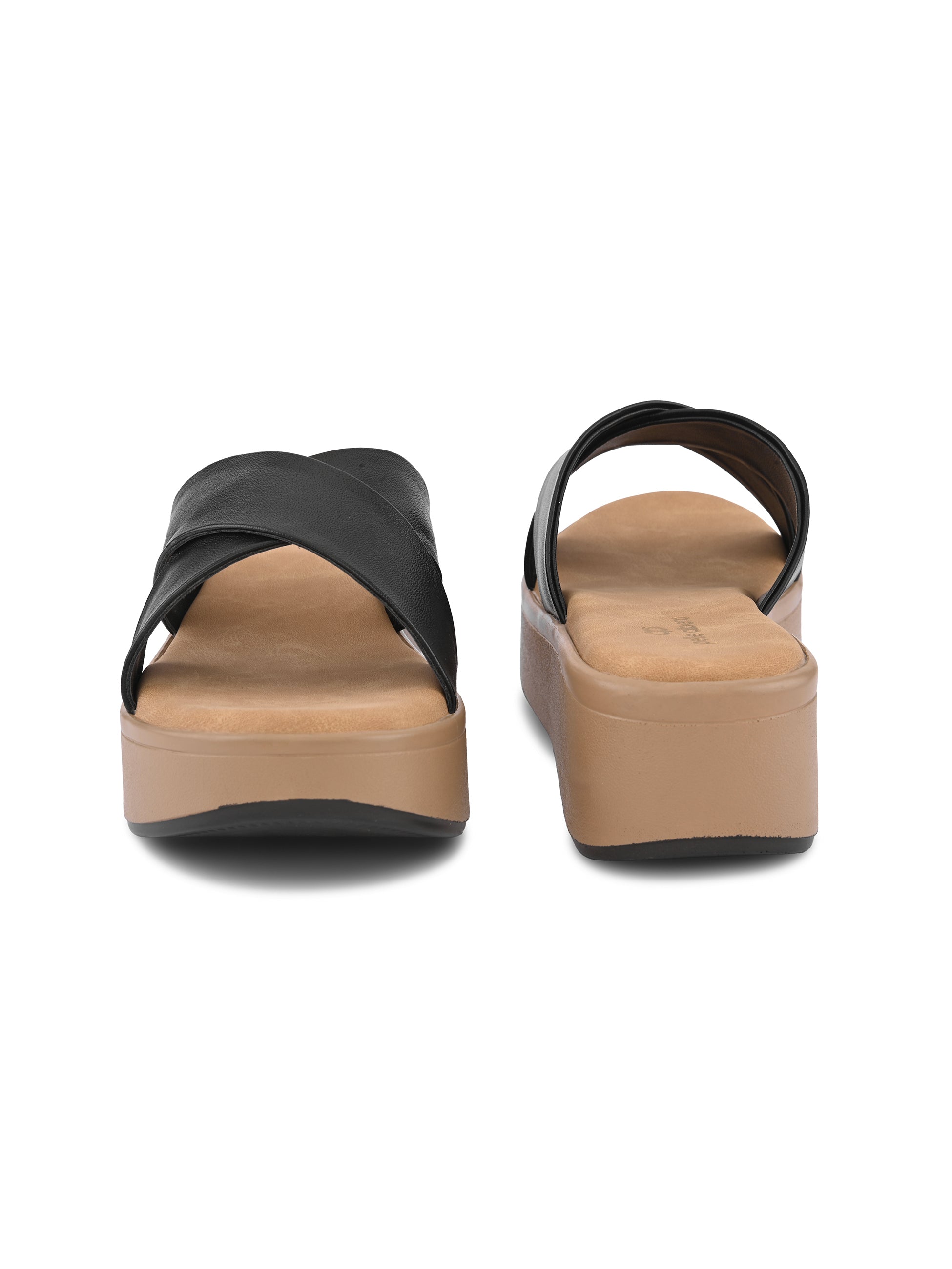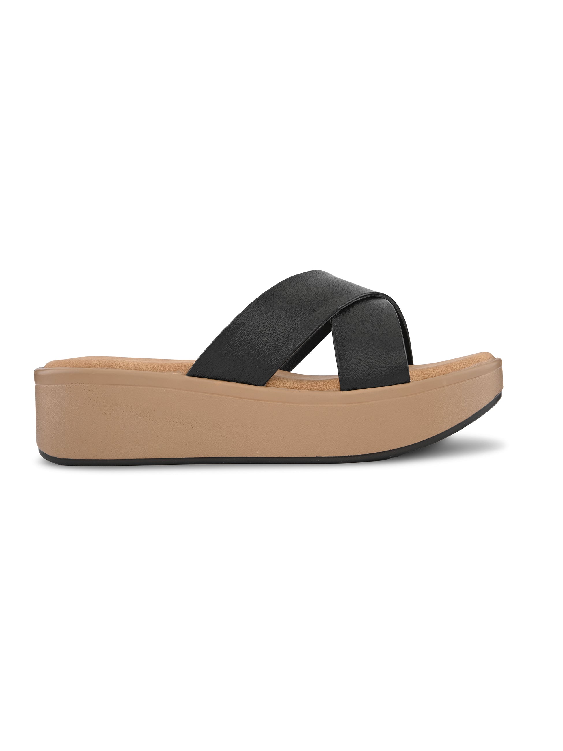 Pelle Albero Women Black Colour Wedge Heel Lightweight Comfort Sandals combine elegant design with superior comfort, making them a perfect pick for both everyday and festive wear. Crafted with a premium soft PU upper and a lightweight cushioned sole, these sandals offer all-day comfort without compromising on style. The ergonomic wedge heel provides subtle height and balanced support, ideal for long hours of wear. The classic black colour adds timeless appeal, easily pairing with ethnic outfits, dresses, or casual jeans. Designed for the modern woman who values style, stability, and comfort in every step.